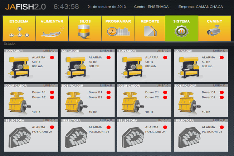 Plataforma y sistema de control semi automático para engorda en centros de cultivo de peces. Programación de perfiles de alimentación en micro raciones. Monitoreo y control mediante un centro de mando.
